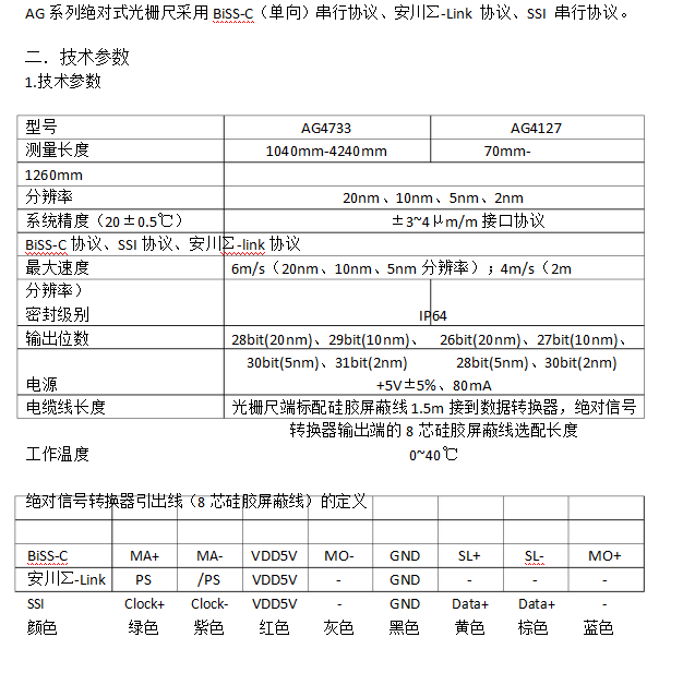 2,當傳感器運動速度過快、距離磁柵尺過遠或沒有感應到磁柵尺時,紅色LED點亮告警(需要重新上電清除錯誤)正常工作時綠色LED點亮,橙色LED閃爍代表絕對值位置錯誤。